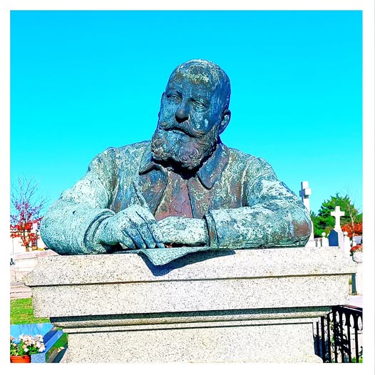 On espère que les œuvres survivent à leurs auteurs. C'est assez rare. Le plus souvent, elles disparaissent corps et âmes. Parfois, les individus survivent plutôt par de petites choses inattendues, comme je le découvre en flânant au cimetière de Sainte-Adresse en ce jour de Toussaint. L'écrivain Hippolyte Fenoux (1842-1913, légion d'honneur) s'est fait faire une jolie pierre tombale, à la fois prétentieuse et amusante. Plus personne ne le lit, il n'est référencé nulle part, je doute même qu'il existe encore en bibliothèque. Mais son buste trône à l'entrée du cimetière, gaillard et souriant - parmi mille tombes modernes désespérantes d'uniformité. En voilà un qui a réussi sa disparition !